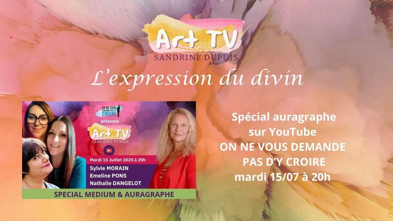 J’ai eu l’honneur d’être interviewée par la douce Sandrine Dupuis sur sa chaîne Youtube ART TV, petite soeur de la chaîne youtube On ne vous demande pas d’y croire, pour expliquer mon parcours artistique et spirituel et comment j’intègre l’art dans ma pratique médiumnique. Vous en saurez plus notamment sur mes Auragrâmes.